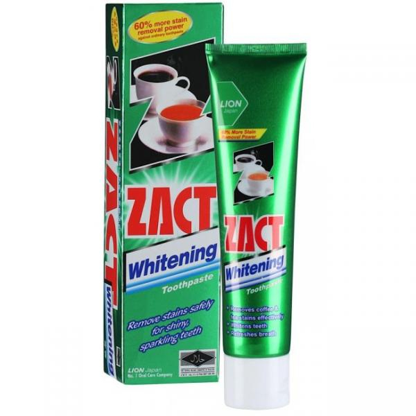 Efektívna bieliaca zubná pasta ZACT rozžiari úsmev, účinne odstraňuje zubné povlaky, škvrny a iné farebné nerovnosti spôsobené hlavne pitím čaju a kávy. Zubná pasta je určená na intenzívnu ochranu ďasien, na udržanie sviežej ústnej dutiny a čistých, prirodzene bielych a silných zubov. Zubná pasta obsahuje fluorid, ktorý posilňuje zubnú sklovinu a tým zabraňuje aj vzniku zubného kazu. Pasta má sviežu mätovú príchuť a neobsahuje cukor.