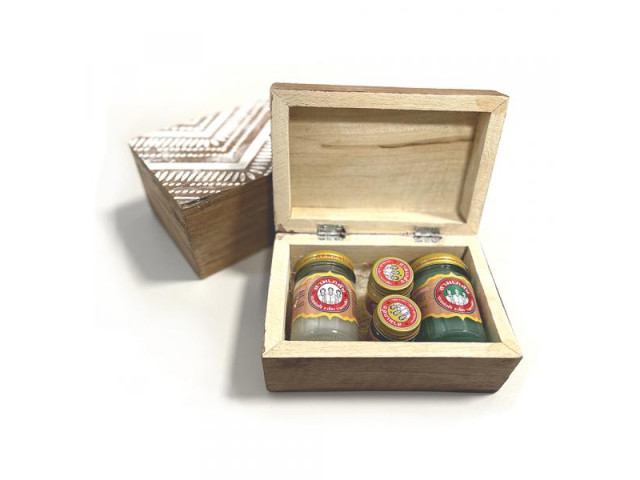 Originálny darček, ktorý poteší milovníkov prírodnej starostlivosti o telo. V elegantnej drevenej škatuľke z mangového dreva nájdete kompletnú kolekciu obľúbených bylinkových balzamov SAMBHESAJ vo všetkých farebných variantoch. Každý balzam má špecifické účinky na uvoľnenie svalov, zmiernenie bolesti a regeneráciu pokožky.