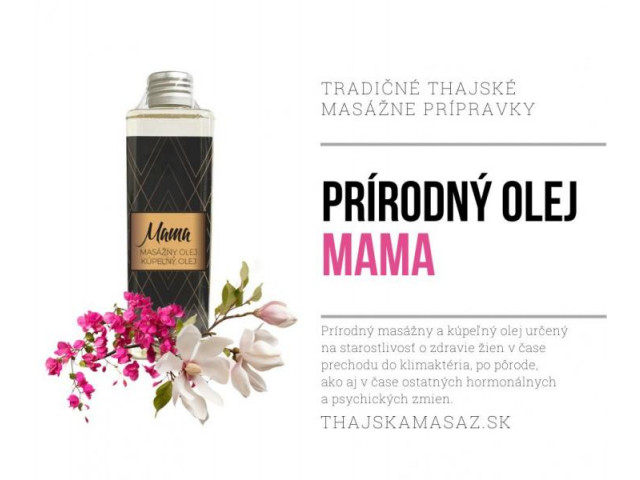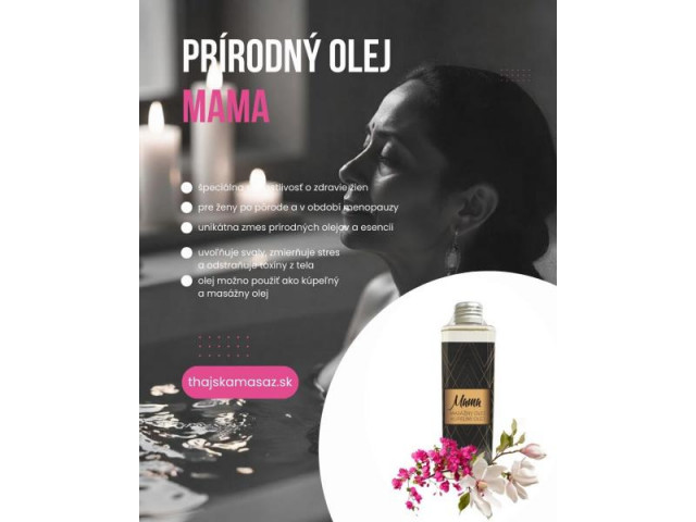 Masážny olej MAMA je špeciálny masážny olej so zložkami, ktoré podporujú prekrvenie pokožky, podporujú jej prehriatie, vyživujú a ošetrujú ju. Vďaka pridaným esenciálnym olejom pôsobí tento olej v kombinácii s masážou ako prevencia a účinná pomoc pri riešení problémov s celulitídou. Olej má aj výrazné relaxačné, aromaterapeutické účinky a nádherne vonia.