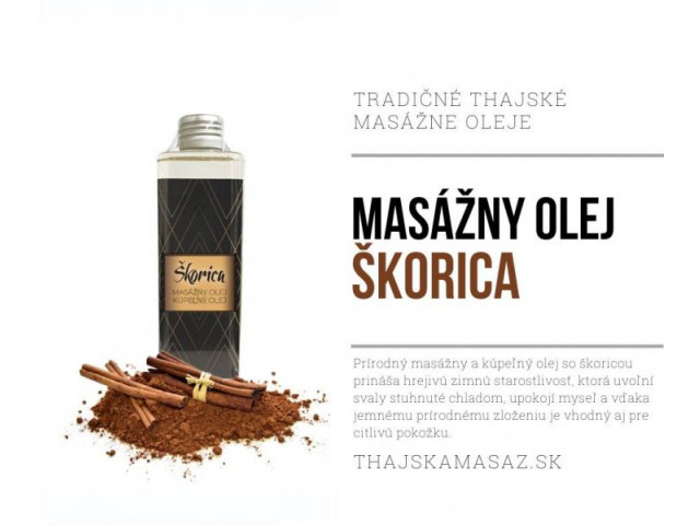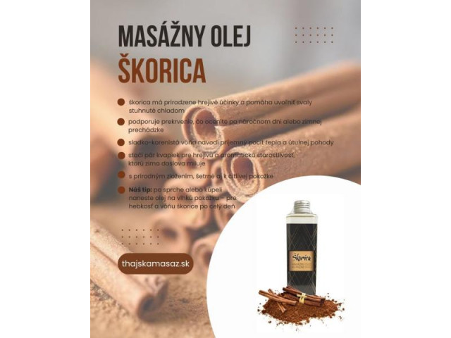Potešte svoje zmysly a doprajte svojej pokožke luxusnú starostlivosť s masážnym a kúpeľným olejom s teplou vôňou škorice známej pre svoje stimulačné a povzbudzujúce účinky. Tento jedinečný olej je navrhnutý tak, aby priniesol zážitok plný relaxácie a pohody, poskytujúc blahodárne účinky aj pre samotnú pokožku tela. Škorica je známa aj svojimi antioxidačnými a protizápalovými vlastnosťami, ktoré pomáhajú stimulovať cirkuláciu a zmierniť napätie svalov.